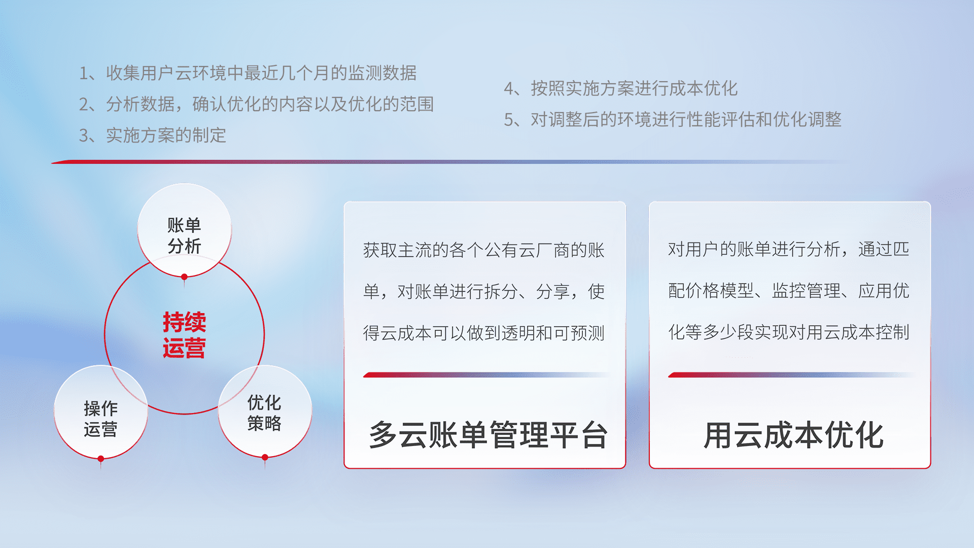 通过多云纳管,,,以统一的资源数据模型把客户的云资源进行抽象和封装,,,,进而实现对多云资源的统一操作,,保障云资源管理的可靠性、、、稳定性与可用性。。。量身定制化运维内容,,配置、、开发运维、、、补丁管理、、、备份、、监控、、认证和访问管理、、、审计和日常巡检等,,,,保障在用云过程中的可靠度,,,稳定度以及高可用率。。。。